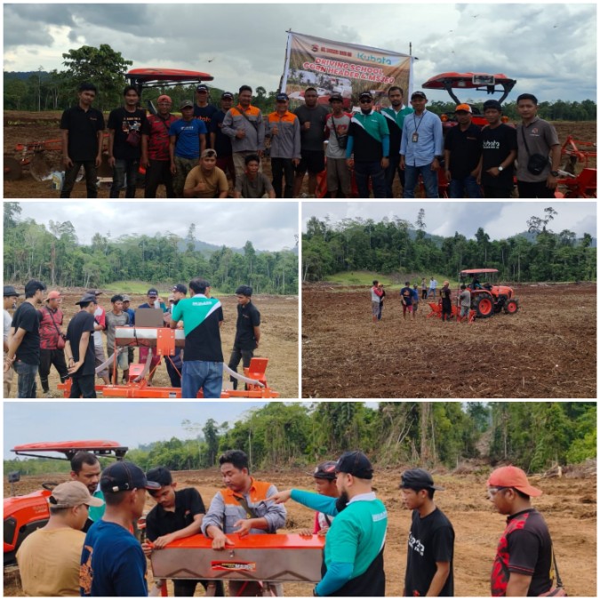 Demplot mekanisasi pertanian menampilkan rangkaian proses lengkap, mulai dari pengolahan lahan, penanaman, hingga pemanenan dengan menggunakan mesin-mesin Kubota guna meningkatkan efisiensi kerja dan hasil panen.