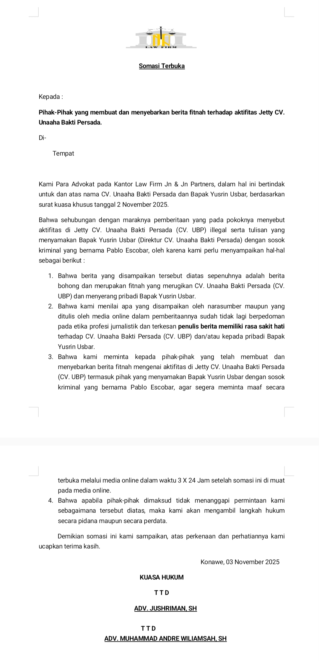 “Berita yang disampaikan tersebut sepenuhnya adalah berita bohong dan merupakan fitnah yang merugikan CV. Unaaha Bakti Persada serta menyerang pribadi Bapak Yusrin Usbar,” tegas Kuasa Hukum CV UBP Jushriman dalam somasinya, Senin (3/11/2025).