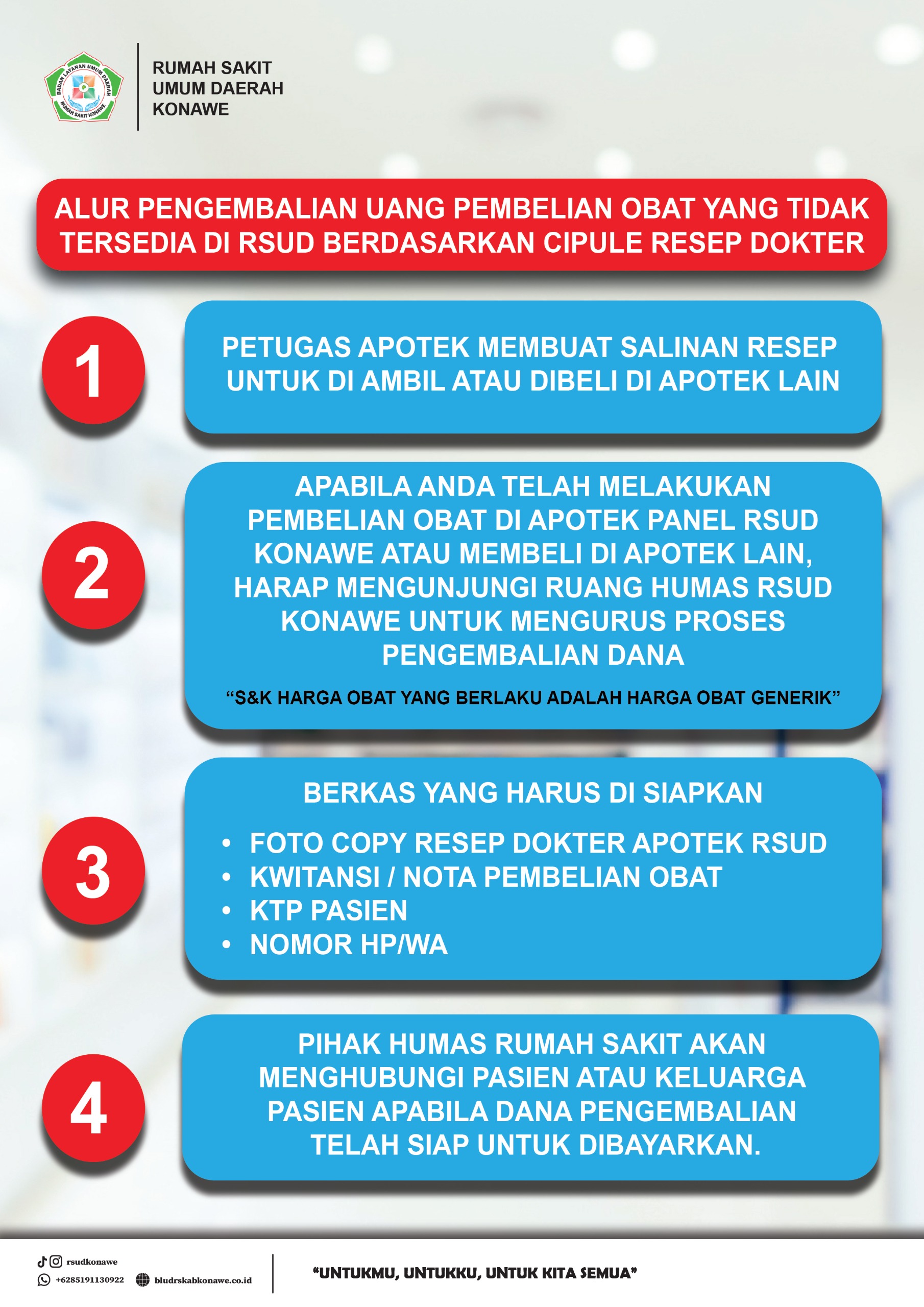 Kunjungan ke Humas: Apabila pasien telah melakukan pembelian obat di luar (apotek panel RSUD Konawe atau apotek lain), pasien atau keluarga diwajibkan untuk mengunjungi Ruang Humas RSUD Konawe guna mengurus proses pengembalian dana.
