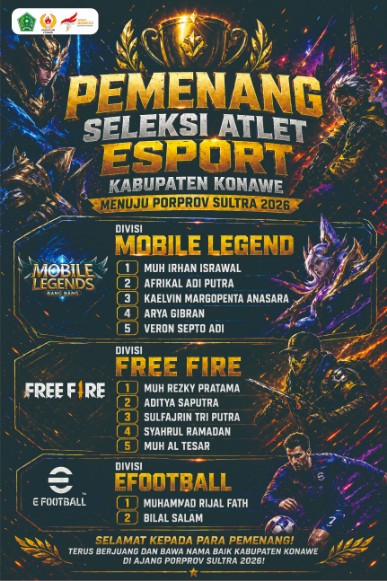Setelah melalui tahapan kompetitif mulai dari babak penyisihan hingga semifinal, ESI Konawe akhirnya menetapkan para pemain terbaik yang akan mewakili daerah pada tiga divisi, yakni Mobile Legends (ML), Free Fire (FF), dan E-Football.